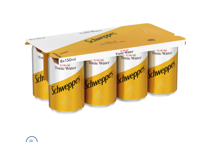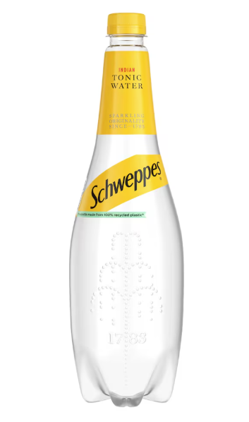Two formats: 1L PET bottles (single) and 150ml cans (6pk or 8pk).