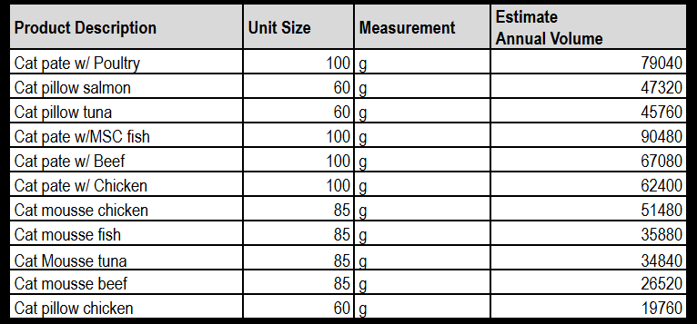 We are seeking producers of Cat Food Pates + Mousses in pack sizes ranging from 60-100g. We require over 560,000 units per annum (estimate in Year 1, and will grow significantly). We are seeking popular products e.g. Cat pate w/ poultry and you can see the core range attached.