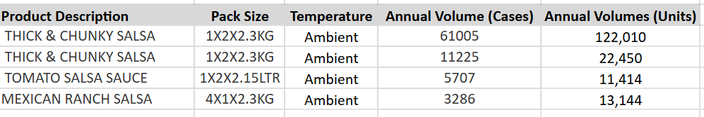 4 SKUs - please see the attachment detailing SKUs and their volumes.