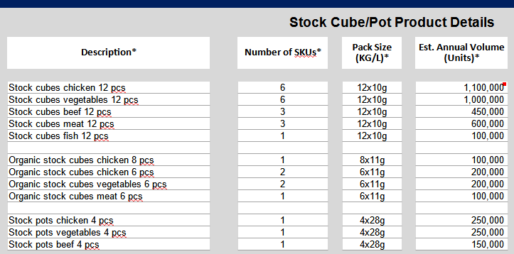 We are looking to speak with large Stock cube producers for our 2025 contract. We wish to speak with producers of Stock cubes and pots across chicken, vegetable, beef, meat fish and organic ranges, as per the attached list. Please see enclosed list for pack sizes too.