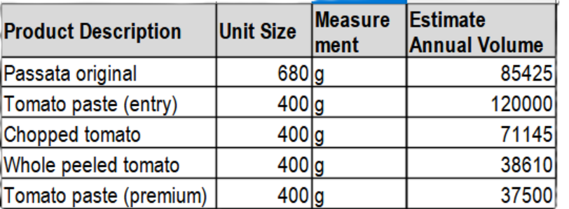 Within this request, we are seeking producers of Tinned Tomato Products, ranging in size from 400g to 680g with both entry-level and premium options. We require over 350,000 units per annum (estimate in Year 1, and will grow significantly). We are seeking popular products (e.g. Passata, Tomato Paste, Whole + Chopped Tomatoes etc.) and you can see the core range attached.