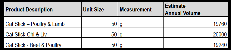 We are seeking producers of Cat Sticks in 50g sizes. We require over 65,000 units per annum (estimate in Year 1, and will grow significantly). We are seeking popular products e.g. Cat stick poultry & lamb and you can see the core range attached.