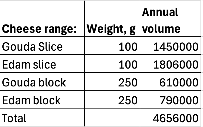 We would like to list four new cheese SKUs: Edam and Gouda, in both sliced (100 g) and block (250 g) formats.