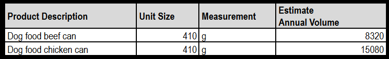 We are seeking producers of Dog Food Cans in 410g size. We require over 23,000 units per annum (estimate in Year 1, and will grow significantly). We are seeking popular products e.g. Dog food beef/chicken and you can see the core range attached.