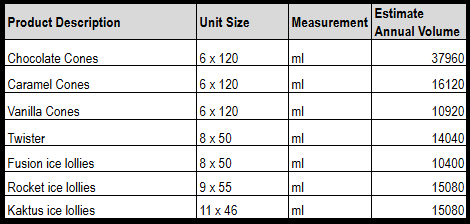 Within this request, we are seeking producers of Ice Cream Lollipops. We require over 120,000 units per annum (estimate in Year 1, and will grow significantly). We are seeking popular products (e.g. ice lollies, ice cream cones, twisters, etc.) and you can see the core range attached.